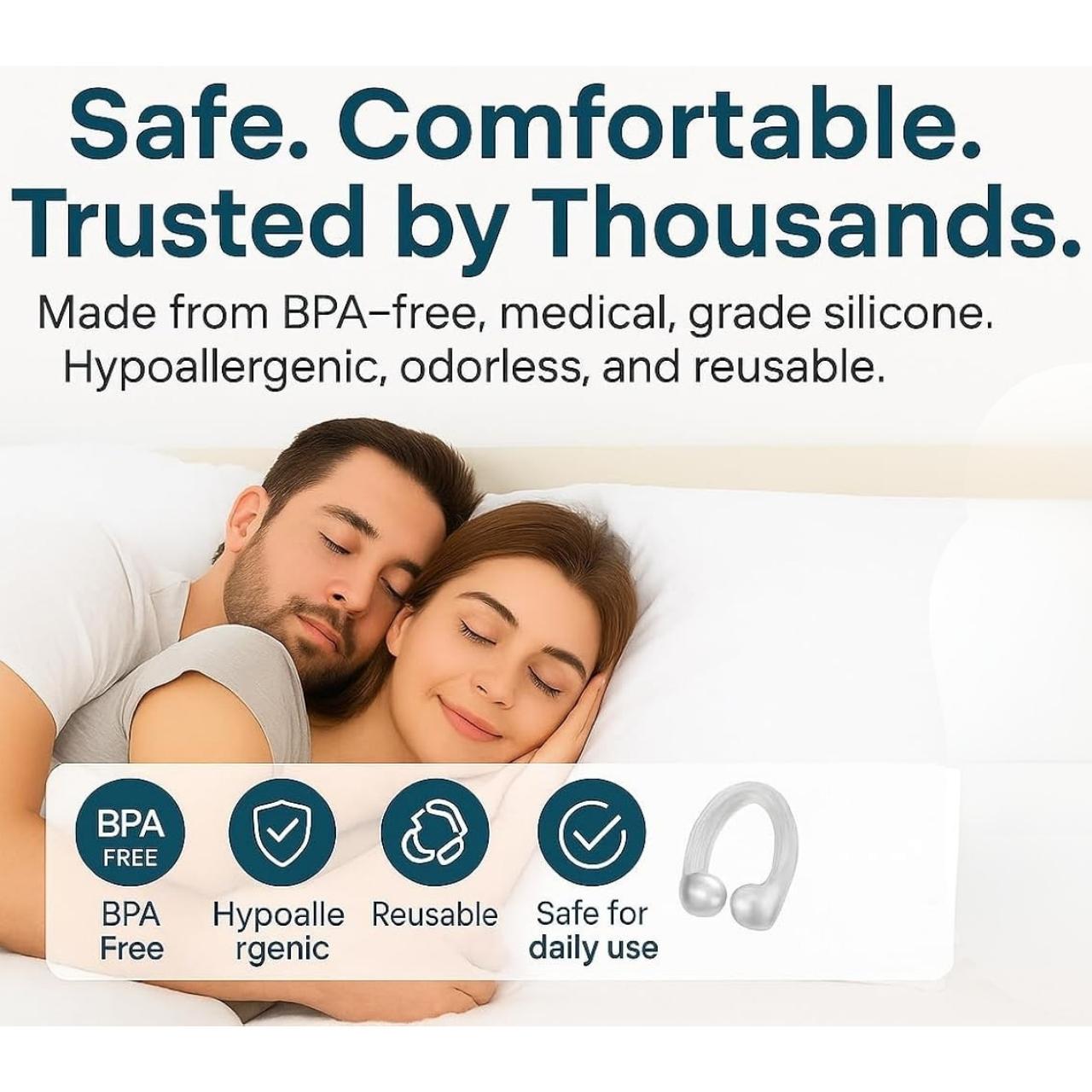Sponka je izdelana iz mehke, prilagodljive silikonske zasnove, ki se popolnoma prilega nosu in ostane na mestu tudi, med obračanjem med spanjem. Silikon je brez BPA in enostaven za čiščenje, zato je uporaba popolnoma varna in higienska. Po vsaki uporabi sponko preprosto operete, nato pa jo pred spanjem uporabite znova.